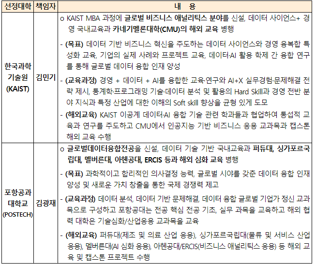 선정된 대학들은 국내 학생들을 대상으로 해외 현지교육과 글로벌 프로젝트를 포함한 데이터 융합 분야 석사 학위과정을 신설하여, 향후 6년간 운영할 계획입니다. 이를 통해 학생들은 다양한 국제적 경험과 교육을 통해 데이터 융합 분야에서 최고 수준의 전문성을 갖추게 될 것입니다.