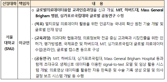 서울대학교는 국제 의료데이터 융합 교과 인증 과정을 신규 개설하여, 초대규모 생체신호 데이터와 의료영상 데이터를 활용한 교육을 진행할 예정입니다. 미국 매사추세츠공대(MIT), 하버드대, 싱가포르국립대(NUS), 메스제네럴브리검병원 등과 협력하여 국제 공동연구를 수행하며, 학생들은 글로벌 의료 데이터 융합 기술의 최전선에서 경험을 쌓게 될 것입니다.